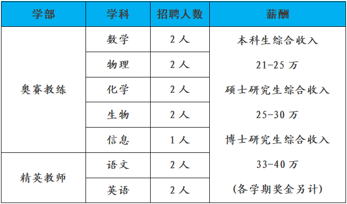 1.學歷及專業(yè)要求:需具備與招聘競賽教練崗位相對應的專業(yè)或相關專業(yè);畢業(yè)于北京大學、清華大學、復旦大學、浙江大學、上海交通大學等C9大學的應往屆本科、碩士、博士畢業(yè)生;
